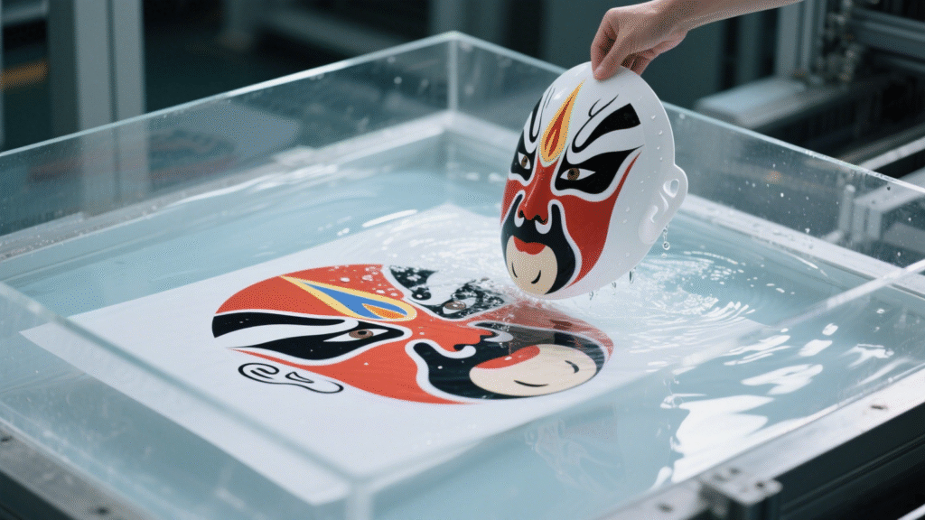 Water transfer printing places a patterned film on water, then immerses the product so the film wraps around its surface, using water pressure to transfer the design evenly onto complex shapes.